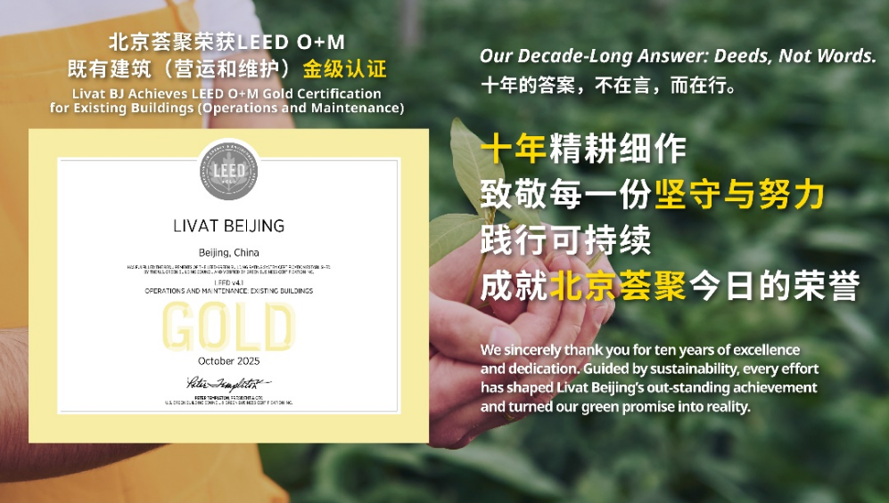 北京荟聚长久坚抓“益于东谈主类,益于地球”的可抓续发展政策,积极引颈健康、可抓续生存。2025年10月,北京荟聚取得LEED O+M既有开导金级认证,标志着其在绿色运营方面的神勇。